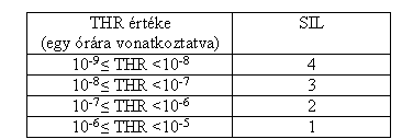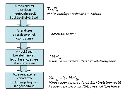 1. táblázat: THR és SIL összerendelés (Megjegyzés az 1. táblázathoz: A 10-9 értéknél szigorúbb követelménnyel rendelkező alrendszert vagy több egyedi alrendszerként, vagy járulékos kockázatcsökkentésekkel SIL4-es rendszerként kell megvalósítani.) Ahogy egy alrendszernek több THR értéke lehet a különböző funkcióvesztésekre, úgy azokból több SIL szint is származhat az alrendszerre. Ezek közül mindig a legkritikusabbat kell figyelembe venni. A folyamat végeredménye az alrendszerekre vonatkozó THR és SIL követelmény.