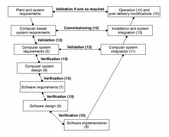 MSZ-EN 61508 (IEC61508) – Funkcionális biztonság (Elektromos vagy programozható rendszerek)A szabvány az általános biztonság elérésének és demonstrálásának módját határozza meg. A korábbi megközelítésekhez képest a biztonság elérésének új módját választja, felismerve, hogy a korszerű, nagy bonyolultságú rendszereknél a már kész rendszer vagy berendezés biztonságos működése csak nehezen (vagy sehogyan sem) ítélhető meg. A szabvány szellemisége az alábbiakban foglalható össze: 1. Az elvárt biztonság szintjének meghatározása A rendszerrel vagy berendezéssel szembeni követelményként megengedett veszélyességi gyakoriságot vagy valószínűséget határoznak meg (THR – Tolerable Hazard Rate). Ez a követelmény valamely kockázatelemzés eredménye – figyelembe kell venni a funkció nemteljesülés következményét és a társadalom kockázattűrő képességét, és ezek alapján a megengedett funkció nemteljesülési gyakoriság meghatározható. A leggyakrabban alkalmazott kockázatelemzési eljárások: ALARP, GAMAB, MEM. Ugyanakkor fontos felismerés, hogy a funkció nemteljesülésért vagy a hardver véletlenszerű meghibásodása, vagy az egyes életciklus-fázisokban elkövetett emberi hibák (hibás specifikáció, hibás szoftver, hibás ellenőrzési eljárás stb.) a felelősek. Amíg a hardver hibák gyakorisága relatíve jól számszerűsíthető és ellenőrizhető, az emberi hibák számszerűsítése nem megoldott. Éppen ezért a THR követelményt a hardver meghibásodásokkal szemben támasztják (és pl. a tervező ez alapján dönt a beépítendő elemek elvárt megbízhatóságáról, illetve a beépítendő redundancia fokáról), majd ez alapján meghatároznak egy másik biztonsági követelményt, a biztonságintegritási szintet (Safety Integrity Level, SIL), amely a teljes életciklussal szemben támaszt követelményeket. Minél alacsonyabb THR érték az előírás (minél kisebb a megengedett funkciótévesztési gyakoriság), annál magasabb a biztonságintegritás szintje. Négy szint létezik, SIL1…SIL4 között, mindegyik szorosan hozzárendelve egy adott THR tartományhoz. (Meg kell jegyezni, hogy léteznek olyan kockázatelemzési eljárások, amelyek közvetlenül a SIL meghatározására irányulnak, pl. kockázati gráf módszere). 2. Teljes életciklusban való gondolkodás Az elkészítendő rendszer biztonságát alapjaiban érintik a teljes életciklus egyes fázisaiban végrehajtott tevékenységek, hiszen az emberi eredetű hibák bármikor elkövethetőek. Éppen ezért fontos az életciklus tervezése, az egyes fázisokkal szembeni követelmények, a bemeneti információ és az előálló eredmények előzetes meghatározása, valamint az életciklus szigorú betartása, ami az egyes fázisok egymásutániságát, valamint a fázisok közötti átlépés lehetőségeinek szabályozását jelenti. A teljes életciklus nem csak a rendszer létrehozását, de a működtetést, a majdani módosításokat, illetve a leszerelést is tartalmazza, hiszen az elvárt biztonságot a teljes élettartam során biztosítani kell, és az üzemeltetés, karbantartás ezt nagymértékben képes befolyásolni. 3. A részt vevők szakképzettsége és függetlensége Az emberi hibák elleni védekezés egyik lehetősége a megfelelő képzettségű személyzet alkalmazása, a másik a többszörös, független személy vagy szervezet által elvégzett ellenőrzések végrehajtása. Az ellenőrzések szintje kettős: verifikálás, vagyis egy fázis eredményeinek a fázis bemeneti információihoz történő visszaellenőrzése (a következő fázisba átlépni csak a sikeres verifikálás után lehet); valamint validálás, vagyis a már elkészült rendszer a kiinduló specifikációhoz történő visszaellenőrzése. Minél magasabb a SIL értéke, annál nagyobb függetlenség biztosítása szükséges.